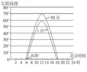 2、单选题  图为“我国某地某月两日太阳高度日变化示意图”。读图,完成问题。