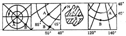 本题解析: 第一、二、四图属于有经纬网的地图上判断方向,要根据经线指示南北方向,纬线指示东西方向判断,注意东西方向判断的原则是“只取劣弧,不取优弧”;第三图属于有指向标的地图,根据指向标的箭头指向北方判断。第一图中心点为北极点,A在B的西北;第二图在北半球,A在B的西北;第三图,A在B的西南;第四图在北半球,A在B的东北。(注意,第二和第四图试题的严谨性值得商榷,图示一定在北半球吗?)
