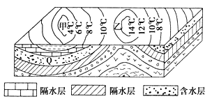【小题1】读图,根据岩层弯曲方向,乙处是背斜构造。根据等温线变化规律,乙处是闭合曲线,温度高,说明海拔低,是盆地地形。D对。