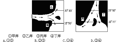 1、单选题 下面两幅图分别是两条大河的河口图,图中小岛因泥沙不断堆积而扩展,最终将与河的哪岸相连