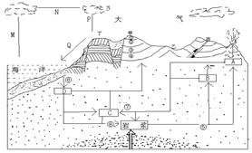 (3)图中⑤--⑧代表岩石圈物质循环过程,⑦表示??作用;⑧表示?作用。