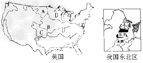 3、综合题  下图为美国和我国东北部农作物分布图,读图并结合所学知识完成相关问题。