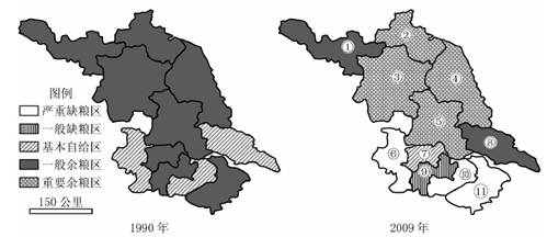 2、单选题 下图示意我国某省1990~2009年人均粮食地域格局变化。读下图,完成小题。