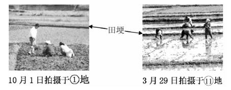 小题3:下面两幅景观图记录了当地主要粮食作物播种情况,箭头指示的地理事物为田埂。与①