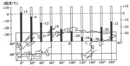 5、单选题 如图为“北纬60°一月份海陆气温示意图”。读图完成问题。