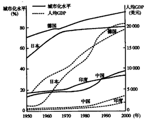 (2)20世纪50年代至80年代,四国中城市化水平增长速度最快的国家是__________。人均GDP增长速度