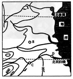 5、综合题 下图中有A、B、C、D四座城市,试从地形、气候和河流等区位因素分析并回答问题。
