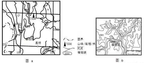 居住在成都的小明和小亮在“寻找最佳避寒地”的课外研究中发现,有“百里钢城”之称的攀枝花1月平均气温达13.6 ℃(昆明为7.7 ℃,成都为5.5 ℃),是长江流域冬季的“温暖之都”。下面图a示意攀枝花在我国西南地区的位置,图b示意攀枝花周边地形。