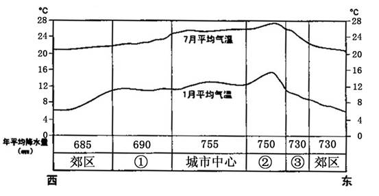 小题1:直接读图可判断,市中心较郊区气温高,降水多。