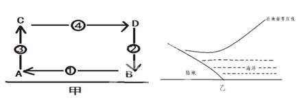(2)若甲图表示海陆风,A,B处近地面,海陆间气压形势如乙图所示,则A为__________(陆地/海洋)。若乙图表示亚欧大陆与太平洋间的气压分布情况,则此时罗马的气候特征为________________;此时亚欧大陆上的气压中心为________________。
