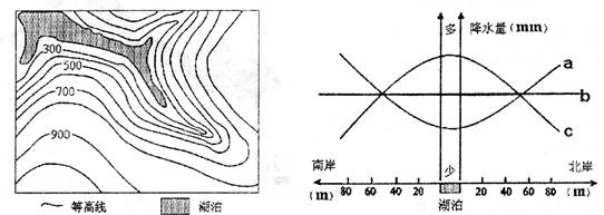 小题1:从等高线地形图中可以看出湖泊处中间低,四周高。题干要求“仅考虑该区域热力环流状况”,再注意到材料中提到“陆地上的江河、湖泊、水库等水域对周边地区热力状况产生影响,因此对降水量也有一定的影响。但这种影响因季节而有差异。”我们不难想到利用湖、陆热力性质差异。冬季:湖泊因热力性质,其温度高于周边陆地温度,导致湖泊上方出现上升气流,而周边陆地上形成下沉气流,上升气流易带来降水,故湖泊处降水量会较多,应为c曲线。夏季:湖泊因热力性质,其温度又会低于周边陆地温度,导致湖泊上方出现下沉气流,而周边陆地上形成上升气流,下沉气流不易带来降水,故湖泊处降水量会较少,应为a曲线。故C正确。