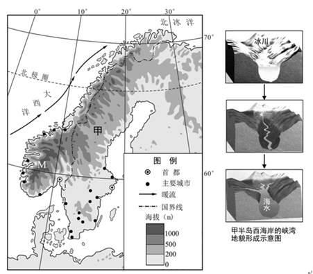(1)描述甲半岛西海岸峡湾地貌的形成过程。(6分)
