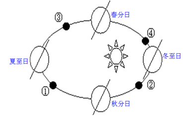1.根据地轴倾斜方向判断,图中地球所在位置对应节气如下图所示,根据地球自转方向的判断,2012年元旦地球在公转轨道位置应在冬至日之后的④处。