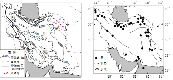 1、综合题 图12示意某国地形,图中甲区域为1000米等高线环绕地区;该国生产的藏红花约占世界总产量的四分之三。图13为该国7级及以上地震震中分布示意图。读图回答问题。