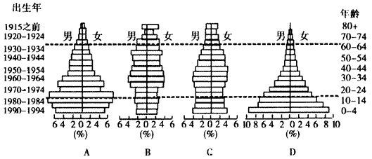 1、单选题 人口金字塔是表示一个国家或地区人口年龄、性别构成的图表。阅读下列四国人口金字塔,根据年龄构成和第二次世界大战等因素判断,表示德国人口构成的是