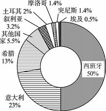 4、单选题 读“2010—2012年世界某种经济作物主产国产量比例示意图”,完成题。