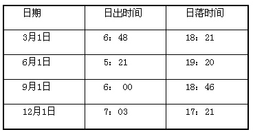 2、单选题  菊花是一种短日照花卉,对日照时长非常敏感。某品种菊花只有当日照时长开始小于10小时30分钟时才进入开花期。下表为武汉市不同日期的日出日落时间(北京时间)表。读表回答16--17题。