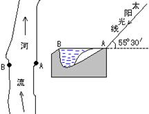 5、单选题 下图为某一河流及其河床AB处的剖面图,某地理兴趣小组成员9月23日正午(地方时)在A处观测到的太阳仰角为55°30′,且太阳光线与河岸接近垂直。据此回答各题。
