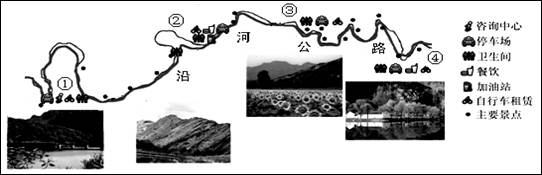 1、综合题 (10分)【旅游地理】我国北方某山区沿河公路两侧的景观有“古里山水画廊”之称。此河段绵延5 6千米,沿途重峦叠嶂山势雄浑,树木花草四季变幻,令人赏心悦目。一下图为‘‘百里山水画廊游览图’’。阅读图文资料,回答问题。