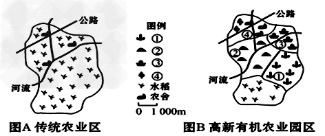 2.在图B中的①、②、③、④处布局大棚蔬菜、茶园、花卉和饲料作物,下列安排合理的是
