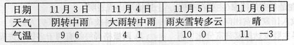 4、单选题 2012 年 11 月 3 —— 5 日北京初雪,持续雨雪量达到 60 年一遇。 11 月4日凌晨,国家气象局对北京市西北部发布了暴风雪红色预警。下表是北京市 11 月 3 日至 6 日的天气情况(气温为白天最高气温和夜间最低气温,单位:℃)据此完成下面问题。