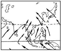 本题解析:(1)根据图示东亚盛行东南季风,南亚盛行西南季风,故判断此时为北半球夏季,即7月。A位于东亚,图示可直接判读为东南季风;B位于南亚,图示可直接判读为西南季风。(2)东南季风来自较低纬度的海洋,故其性质高温多雨。(3)B为南亚夏季的西南季风,其成因是由于南半球的东南信风在夏季越过赤道,进入北半球,则在地转偏向力向右偏的影响下,而形成西南季风。(4)此时为北半球夏季,地球公转接近于远日点附近,则公转速度较慢,此时太阳直射点位于北半球,故北半球昼长夜短。