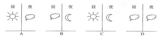 2、单选题 下图表示某地同一时期四种昼夜情况,其中表示夜晚气温最低的是 ( )