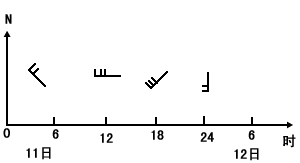 5、单选题 下图是我国某城市在一次气旋过境过程中的风向和风力变化图。风杆(长线段)上绘有风尾(短线段)的一方指示风的来向。每一道风尾表示风力2级。由图判断该气旋中心的移动方向是