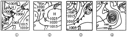 2、单选题 读图,由于气压高低的变化,使杭州四季呈现多变的天气现象。下列天气图依据春夏秋冬季节的排序,正确的是