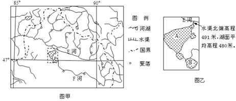 (1)图甲中E河流域的聚落主要分布在什么地貌类型上,并解释该地貌的形成过程。(6分)