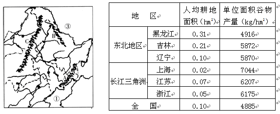 5、综合题 下图是东北地区简图,下表是“东北地区和长江三角洲部分省区人均耕地面积及谷物单产的比较表(2002年)”。读图和表格,回答下列问题。(9分)