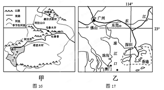 材料二 喀什所在地区简图(图16)和深圳所在地区简图(图17)。