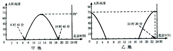 4、综合题  我国甲地中学生与南半球乙地中学生在同一天观测太阳高度的变化,并将观测结果绘成下图,甲地学生发现此日测得的最高太阳高度比前一天小。据此回答下列问题。(10分)