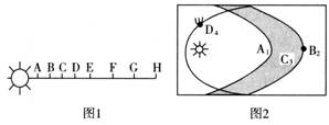 (1)若图1为太阳系中八大行星排列顺序示意图,表示巨行星的字母是 、 。