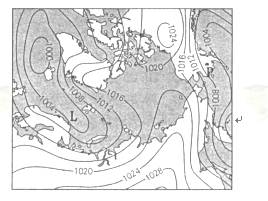 4、单选题  下图示意某区域l2月某日海平面等压线分布,读图完成下列各题。