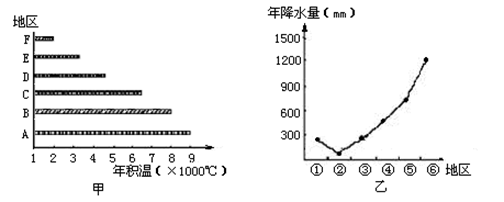 2、单选题 年积温是指一年内日平均气温≥10℃持续期间日平均气温的总和,即活动温度总和。下面是依据我国多年平均气候资料,按一定方向分别选取了A→F和①→⑥共12个地区,分类绘成的甲、乙两图,读图完成下列问题。