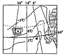 4、单选题 读某地一月平均气温分布图(阴影部分为陆地,空白处为海洋),完成下列各题。
