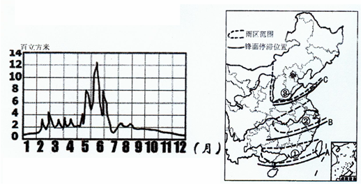 3、综合题  下图是“我国东部某河流多年平均径流量季节变化图”和”我国东部雨带推移示意图”,读图回答:(8分)