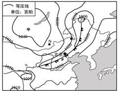 【小题1】读图可知,图中甲地中间气压高,四周气压低,是高压中心,故为反气旋;乙地中间气压低,四周气压高,是为低压中心,故为气旋。