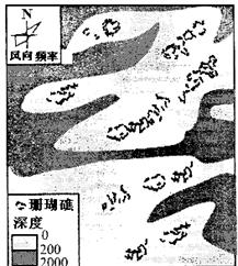 1、综合题 珊瑚礁的生长发育主要受地质和海底地貌形态的影响,研究发现风向也会影响珊瑚礁的形态。下图为“某海域珊瑚礁群的分布图”。据此完成下列各题。