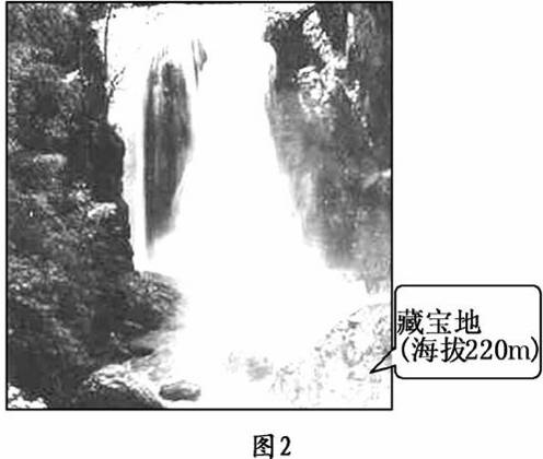 1、单选题 某次地理夏令营活动的主办者策划了一次“寻宝”活动。在活动前,每位营员均会获得一张地图(图1)和一张瀑布照片(图2)。据此回答问题。