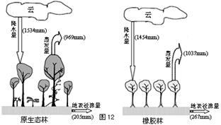 西南某省份为大力种植橡胶,一直在砍伐原生态林。橡胶林涵水能力很差,为保证橡胶产量,需要扩大间距,控制单位面积植株数。下图为原生态林和橡胶林的水循环示意图。
