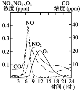 4、单选题 读“某日洛杉矶几种污染物浓度日变化图”,根据“光化学烟雾”的相关知识,回答下题。