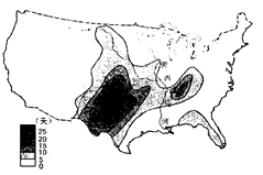 小题1:根据该灾害的主要分布地区位于中央大平原,美国主要的农业生产地区,且其分布天数最密集地区集中于中部,故判断为30年代,不合理的农业生产导致的黑风暴。