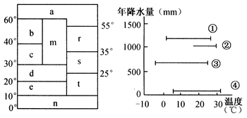 3、单选题 下图中,左图是“北半球气候类型分布模式图”,右图表示四个地区的气温年内变化和年降水量情况。据此回答1—2题。