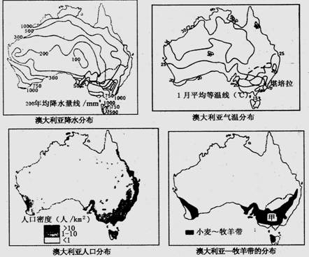 材料一:澳大利亚降水、气温、人口和小麦-牧羊带的分布图