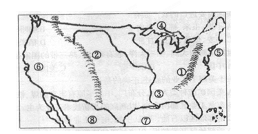(1)结合图示的国家轮廓判断,该国家表示美国,①②分布表示美国东部和西部地区的山脉:阿巴拉契亚山脉和落基山脉;