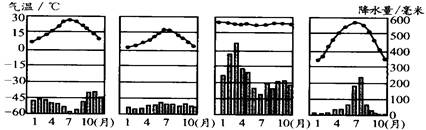 4、单选题 该图是四幅气温和降水量各月变化图,排序与图中顺序相符的是