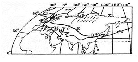 (1)从图中可以看出,大陆上0℃等温线向南弯曲,表明大陆气温低于同纬度的海洋,所以为冬季。
