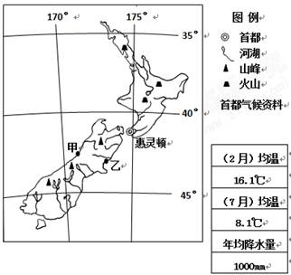 1、综合题  (28分)新西兰是太平洋西南部的一个岛屿国家。面积26.8万平方千米,人口439万。该国资源环境独特,经济发展水平高。 根据新西兰概况图,结合所学知识,完成(1)-(5)题。